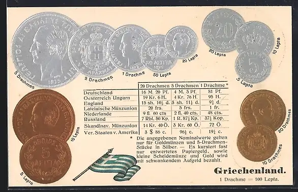 Präge-AK Griechenland, Münzen und Flagge, Umrechnungstabelle