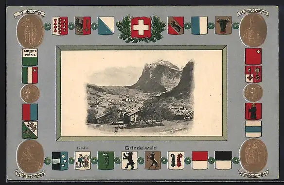 Präge-AK Grindelwald, Ortsansicht aus der Vogelschau, Wappen-Passepartout