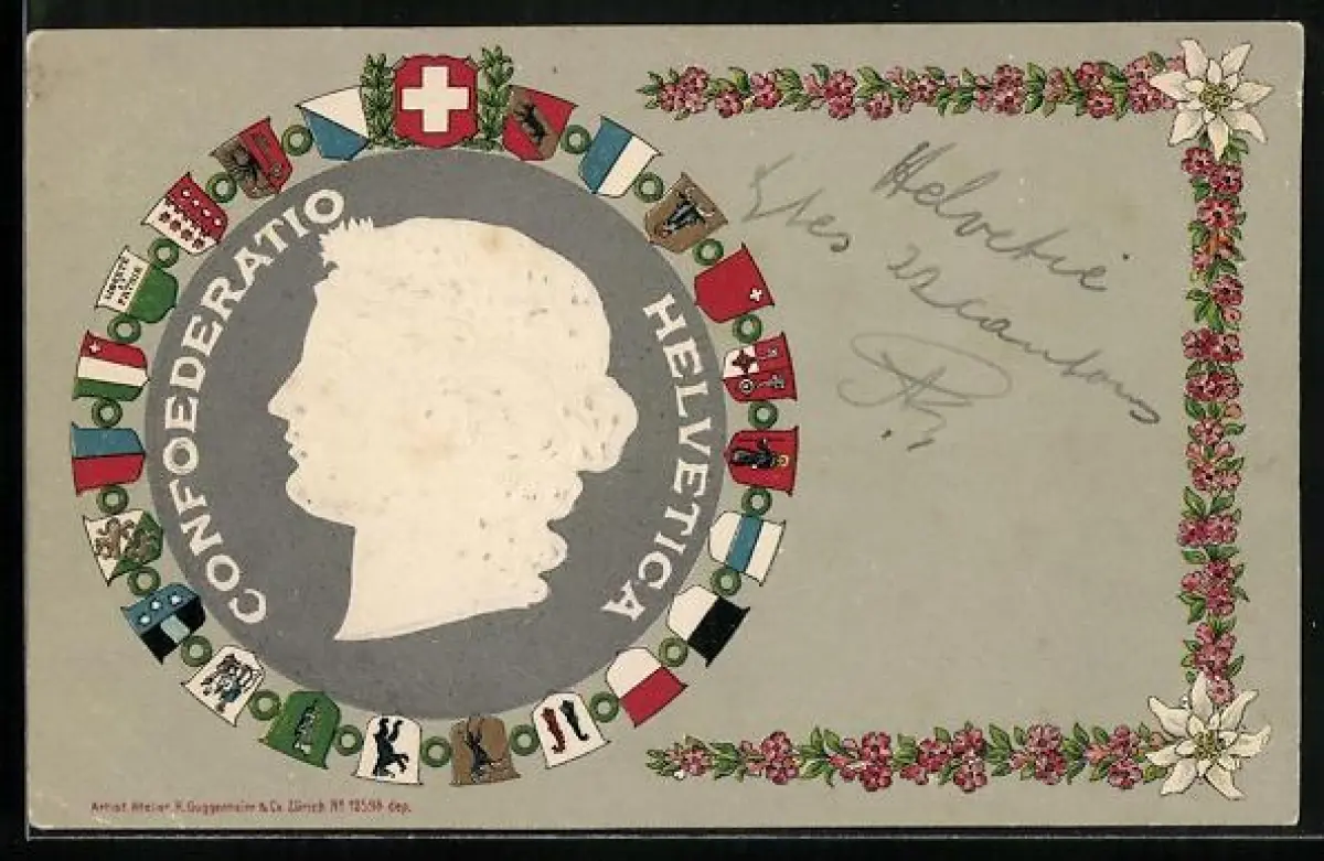 Präge-AK Helvetia im Profil mit den Wappen der Schweiz