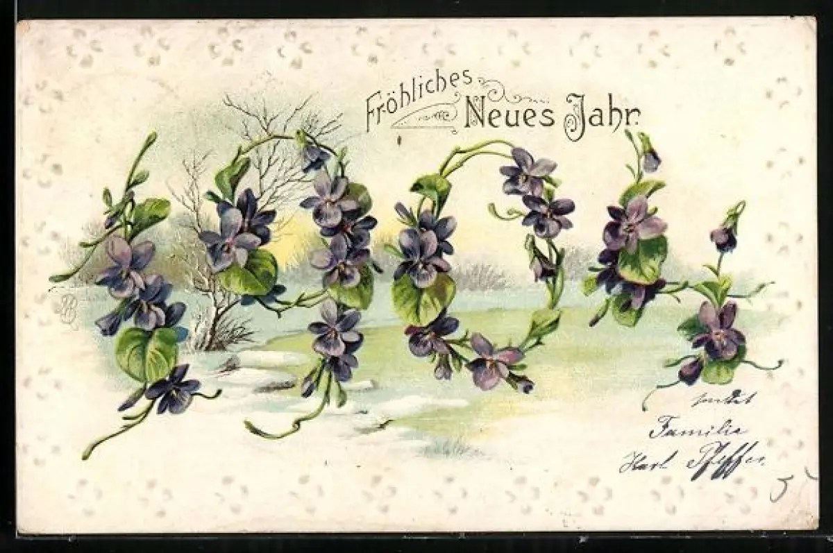 Präge-AK Jahreszahl 1905 aus Veilchen, Idyllische Schneelandschaft im Hintergrund, Neujahr
