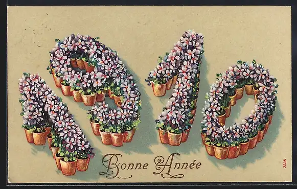 Präge-AK Jahreszahl 1910 aus Veilchen in Blumentöpfen