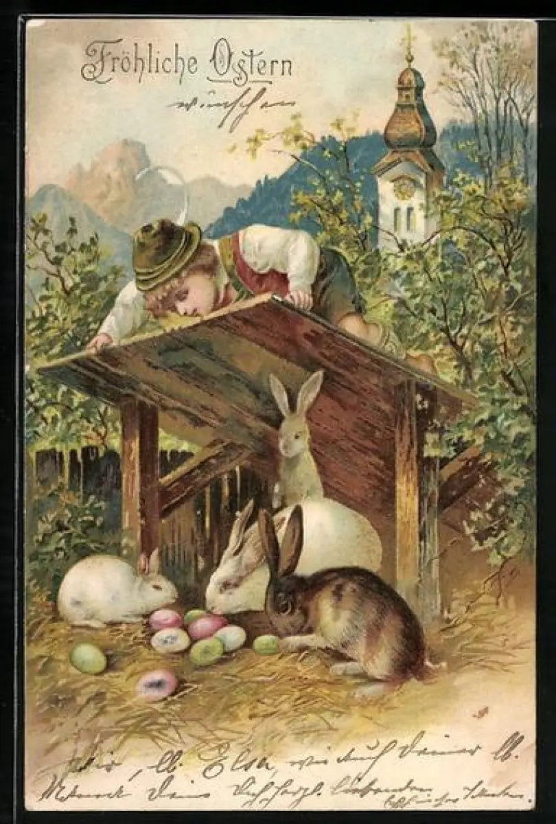 Präge-AK Junge mit Hut beobachtet Osterhasen mit bunten Ostereiern, Fröhliche Ostern