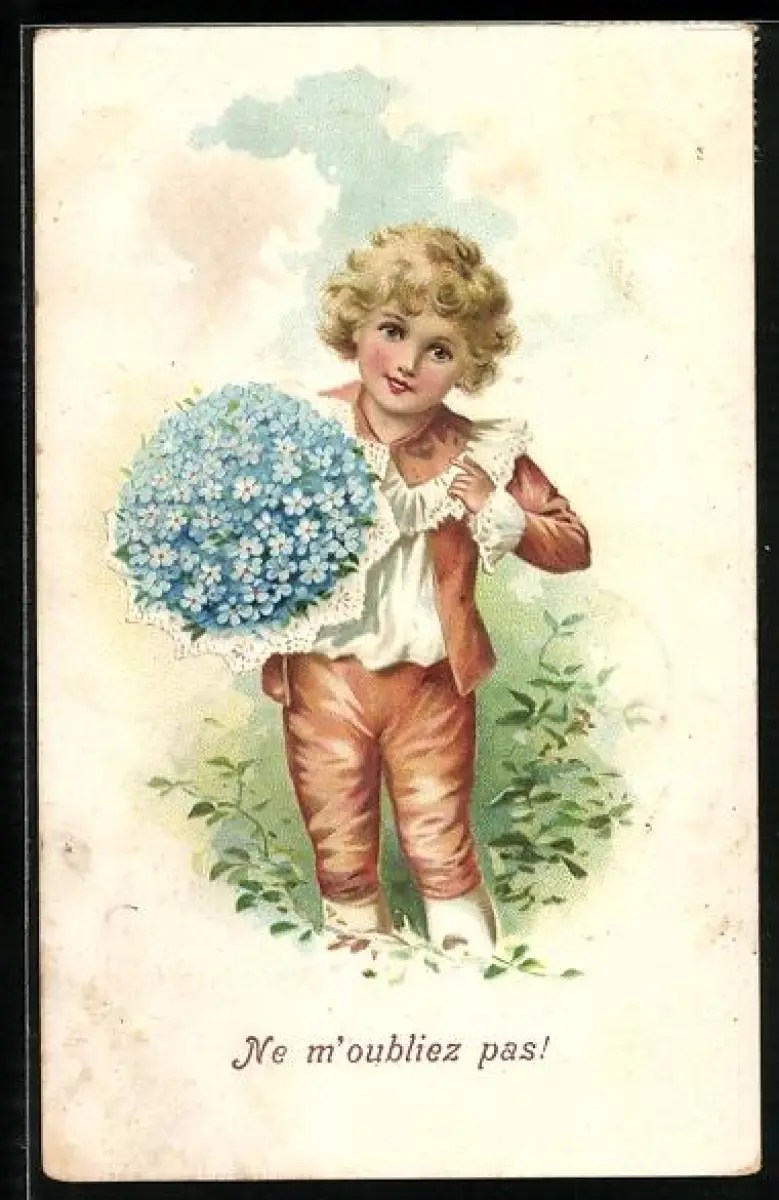 Präge-AK Kind mit einem Strauss Vergissmeinnicht bittet darum, nicht vergessen zu werden