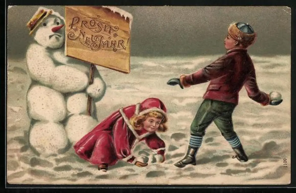 Präge-AK Kinder bewerfen einen Schneemann mit Schneebällen, Prosit Neujar