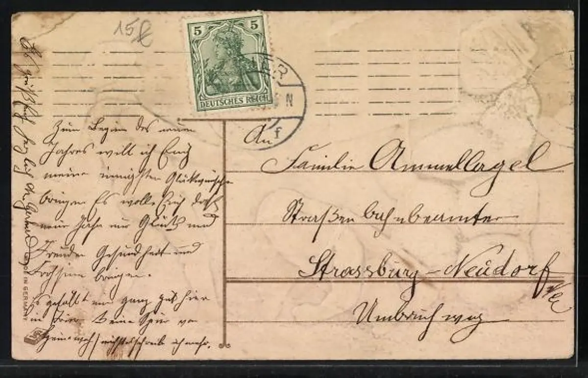Personenbezogene Daten auf der Rückseite der Karte wurden durch blauen Textmarker unkenntlich gemacht. Die blauen Stellen sind auf die Vorderseite durchgeweicht und wirken sich negativ auf das Postkartenfoto aus