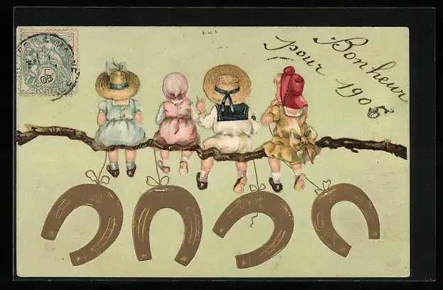 Präge-AK Kinder sitzen auf einem Zweig mit goldenen Hufeisen