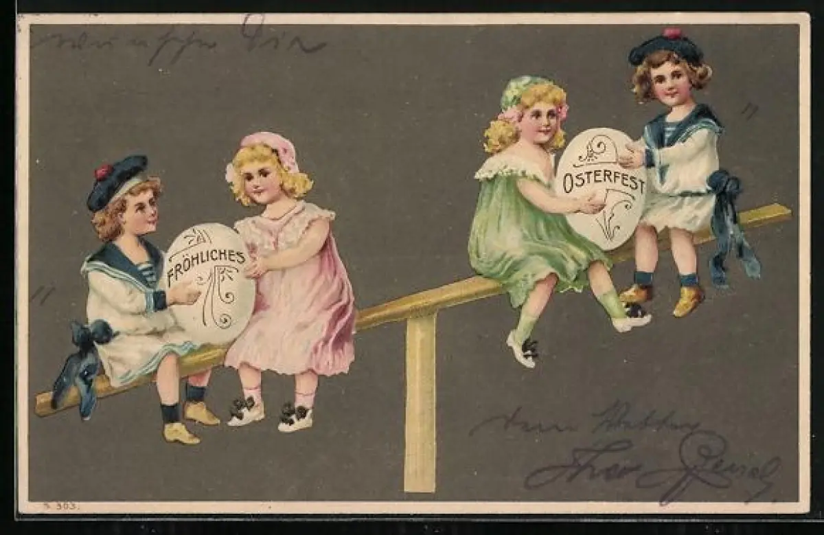 Präge-AK Kinder sitzen mit Ostereiern auf einer Wippe, Ostergruss