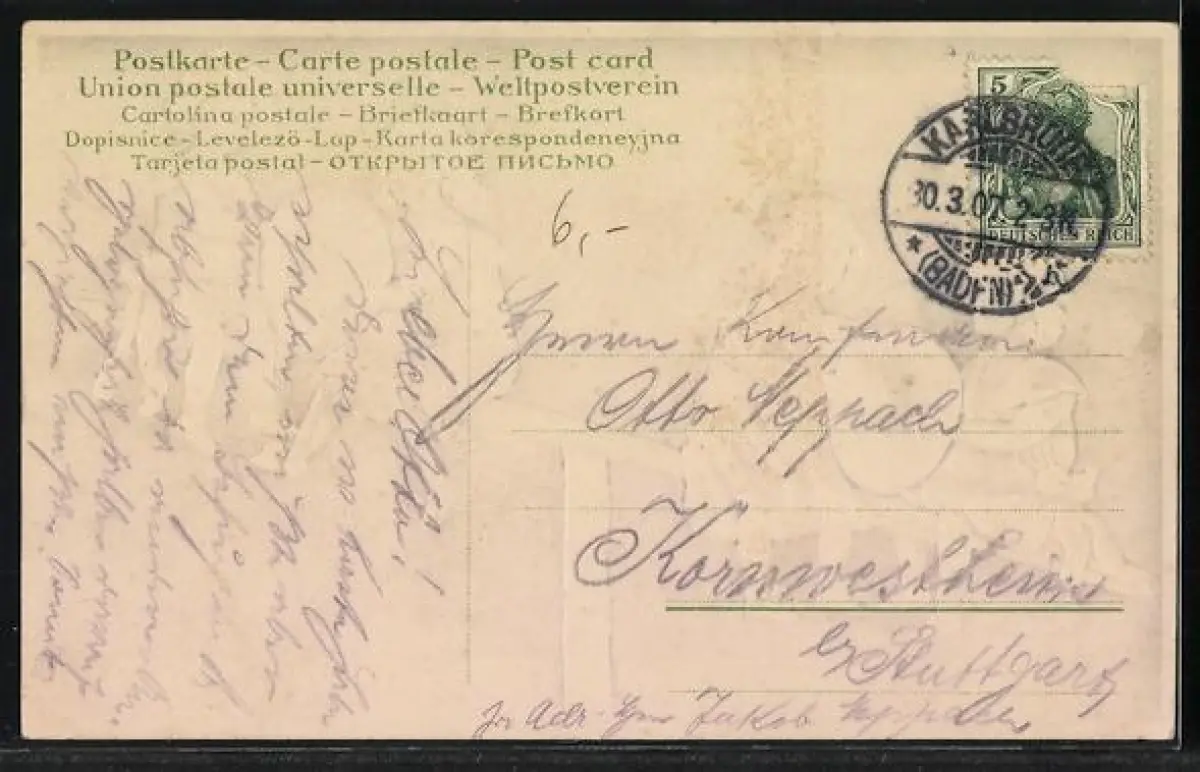 Personenbezogene Daten auf der Rückseite der Karte wurden durch blauen Textmarker unkenntlich gemacht. Die blauen Stellen sind auf die Vorderseite durchgeweicht und wirken sich negativ auf das Postkartenfoto aus
