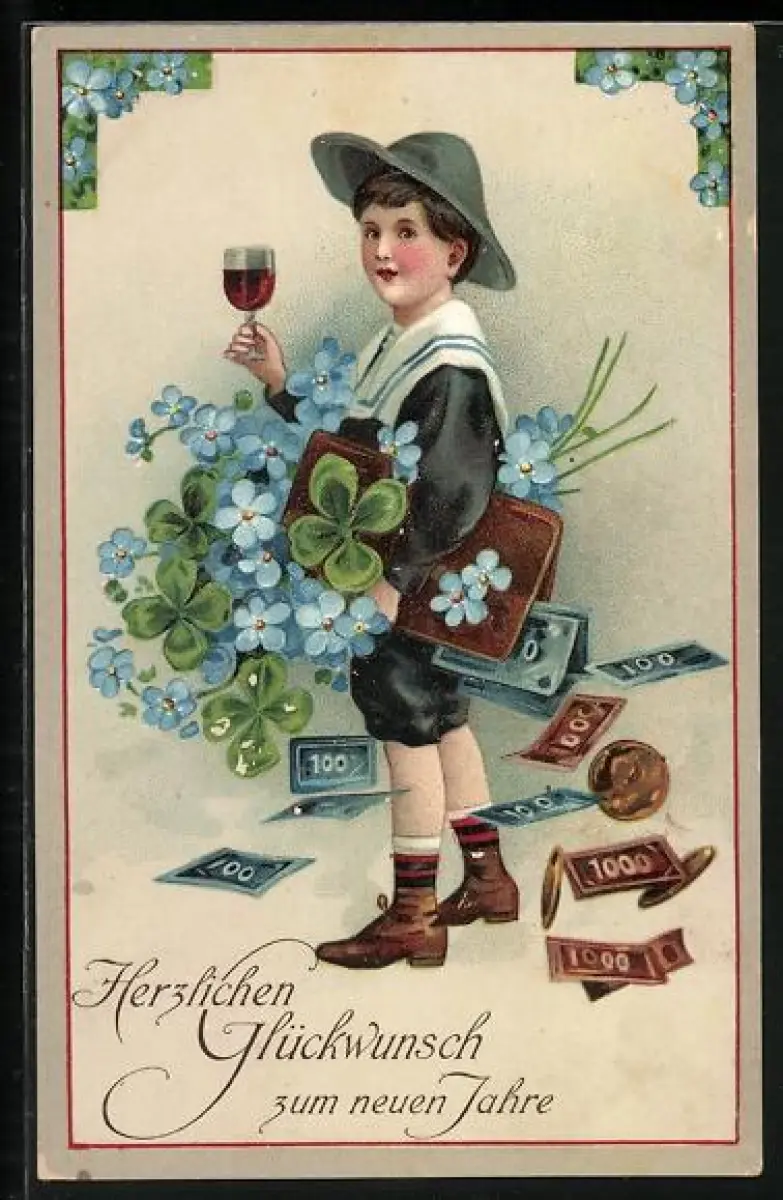 Präge-AK Knabbe mit Ledermappe mit Geldscheinen und Weinglass