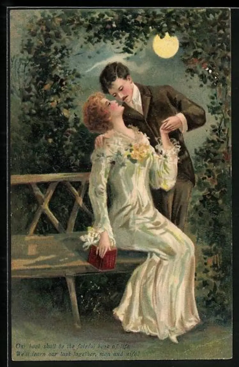 Präge-AK Liebespaar an einer Bank im Mondschein