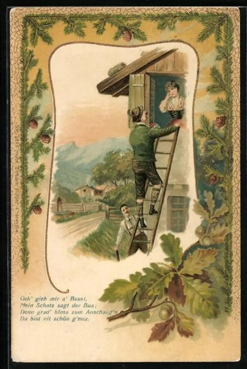 Präge-AK Mann auf Leiter bei Frau am Fenster, Erotik
