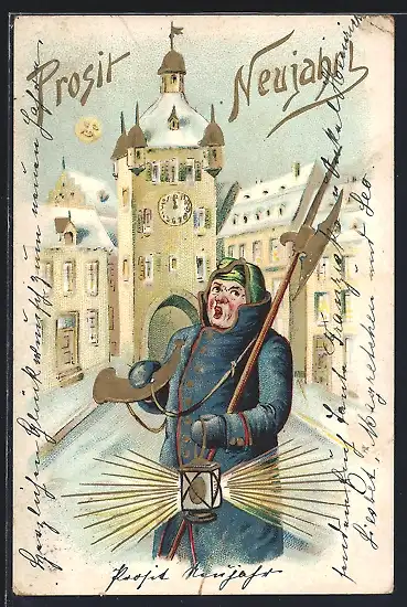 Präge-AK Nachtwächter mit Laterne am Tor, Neujahrsgruss