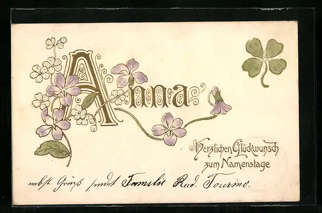 Präge-AK Namenstag Anna, Veilchen und Kleeblatt