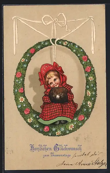 Präge-AK Namenstag, Kleines Mädchen im Blumenkranz