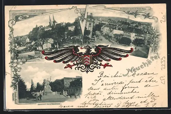 Präge-AK Neuchâtel, Ortspartie, Denkmal, Strassenpartie