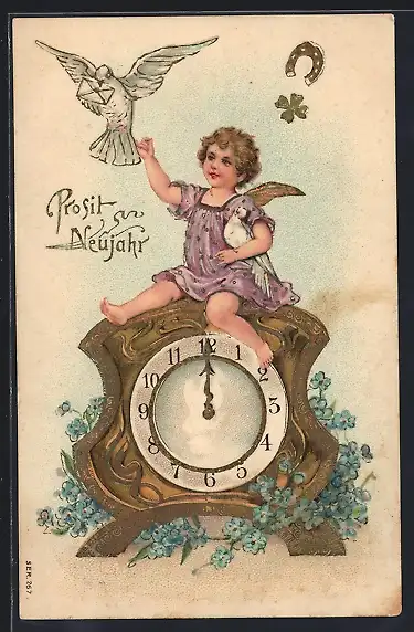 Präge-AK Neujahrsengel auf goldener Uhr schickt Brieftaube los