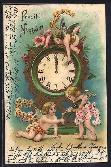 Präge-AK Neujahrsengel mit Uhr um Mitternacht