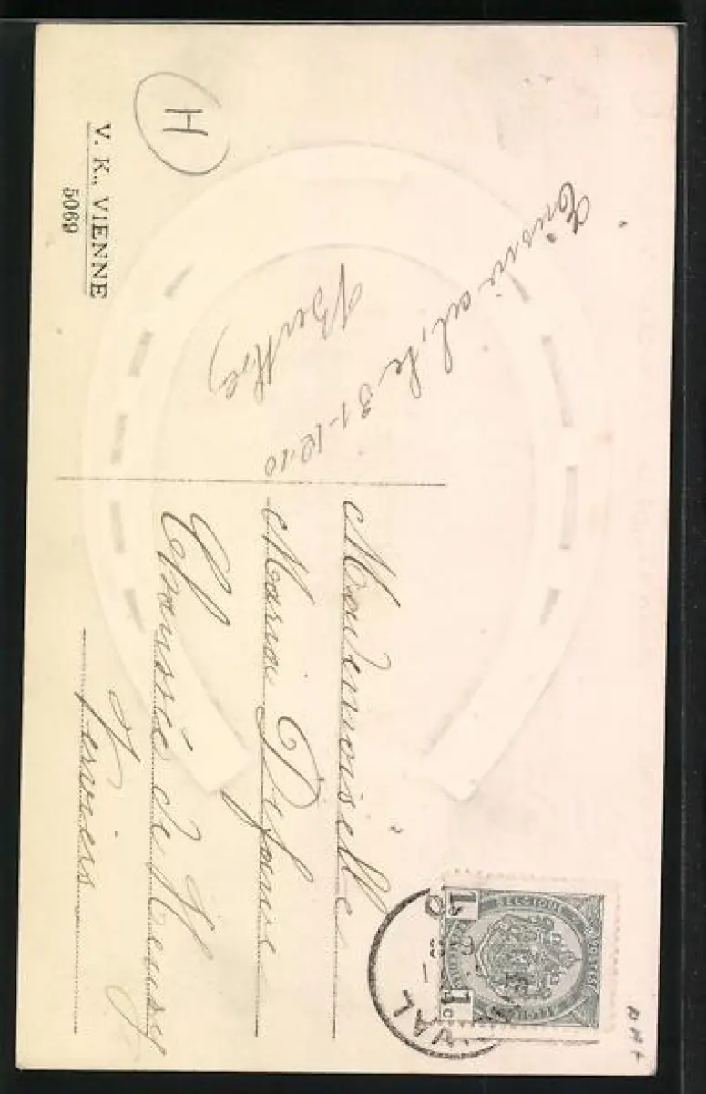 Präge-AK Neujahrsgrüsse, Junge Frau mit filigranem Haarschmuck und Kleeblättern im Hufeisen-Rahmen, Jugendstil