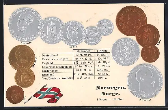 Präge-AK Norwegen, Münzen und Flagge, Umrechnungstabelle
