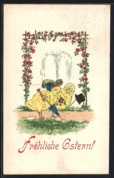 Präge-AK Osterküken beim Spaziergang vor einer Fontäne