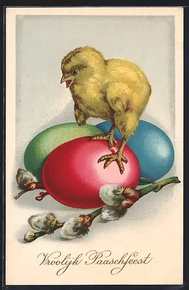 Präge-AK Osterküken steht auf bunten Ostereiern, Vroolijk Paaschfeest