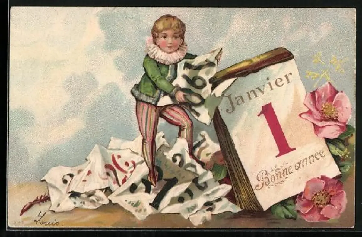 Präge-AK Prosit Neujahr, Knabe mit Kalender, Januar 1