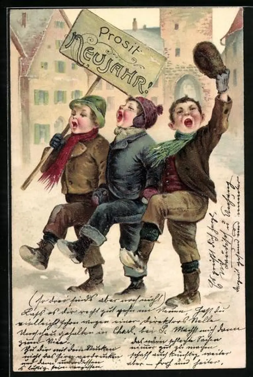 Präge-AK Prosit Neujahr, Singende Knaben stapfen durch den Schnee