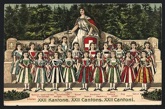 Präge-AK Schweiz, Helvetia mit jungen Frauen: Luzern, Basel, Tessin