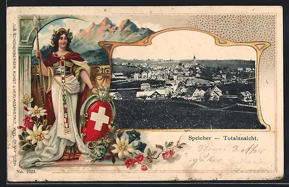 Präge-AK Speicher, Ortsansicht im Passepartout mit Helvetia