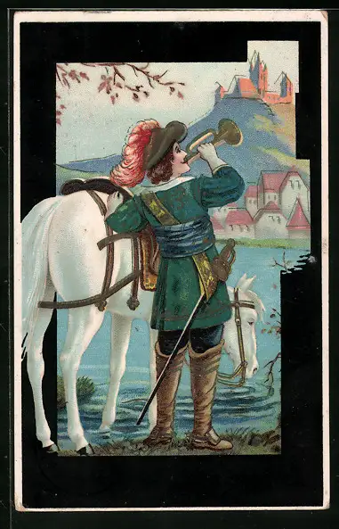 Präge-AK Trompeter mit Pferd am Ufer vor der Stadt