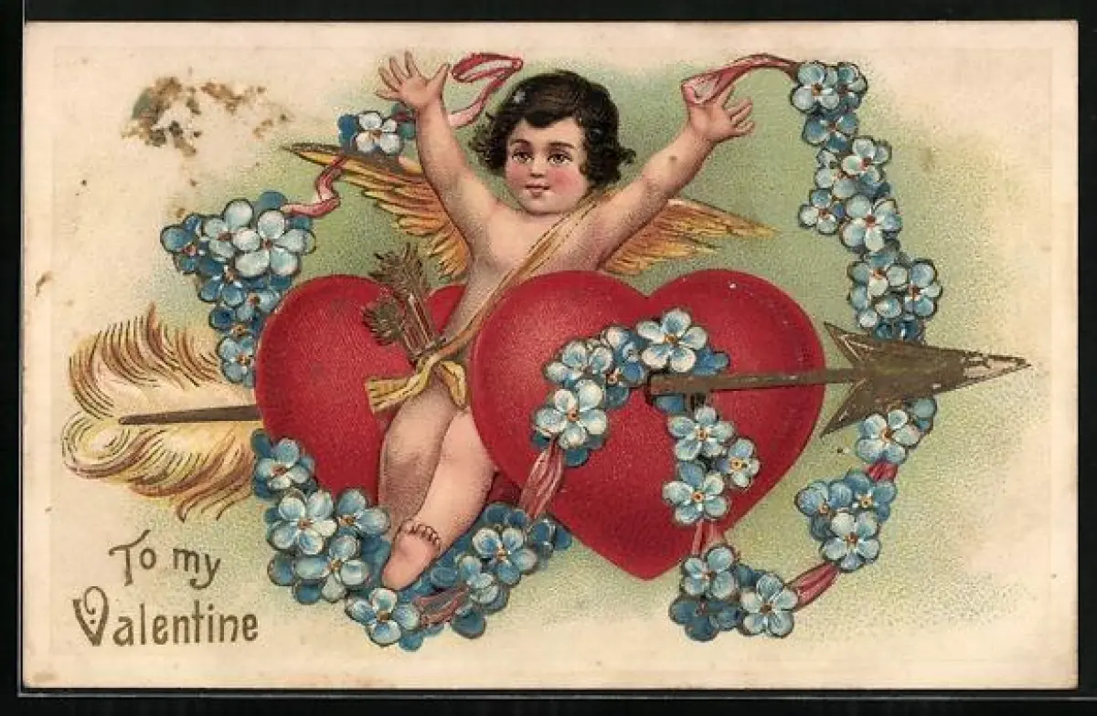 Präge-AK Valentinstag, Amor mit zwei aufgespiessten Herzen auf einem Pfeil