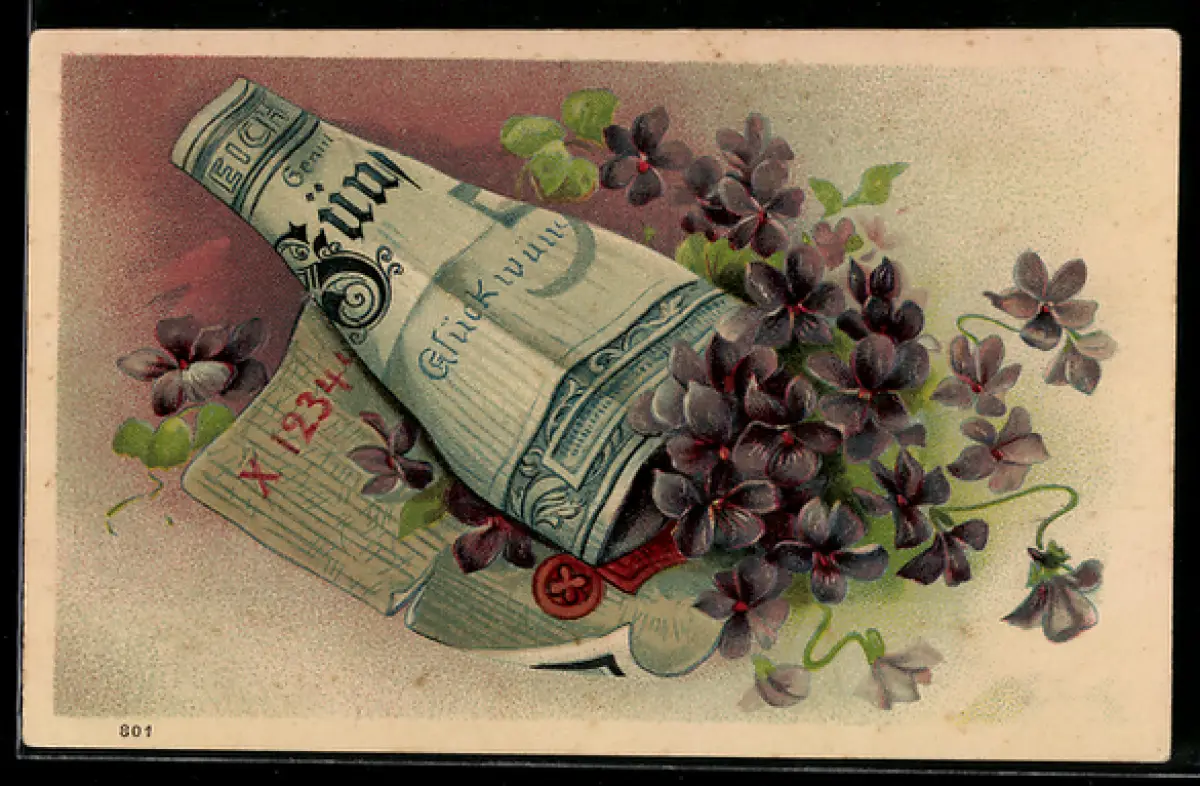 Präge-AK Veilchen in einem Geldschein