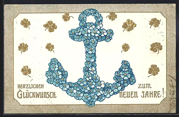 Präge-AK Vergissmeinnicht-Anker mit Glücksklee, Neujahrsgruss