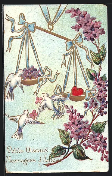 Präge-AK Weisse Tauben an einer Waage mit Blumen