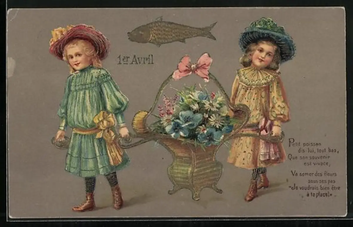 Präge-AK Zwei Kinder mit einem Korb voller Blumen und einem Fisch, 1er Avril