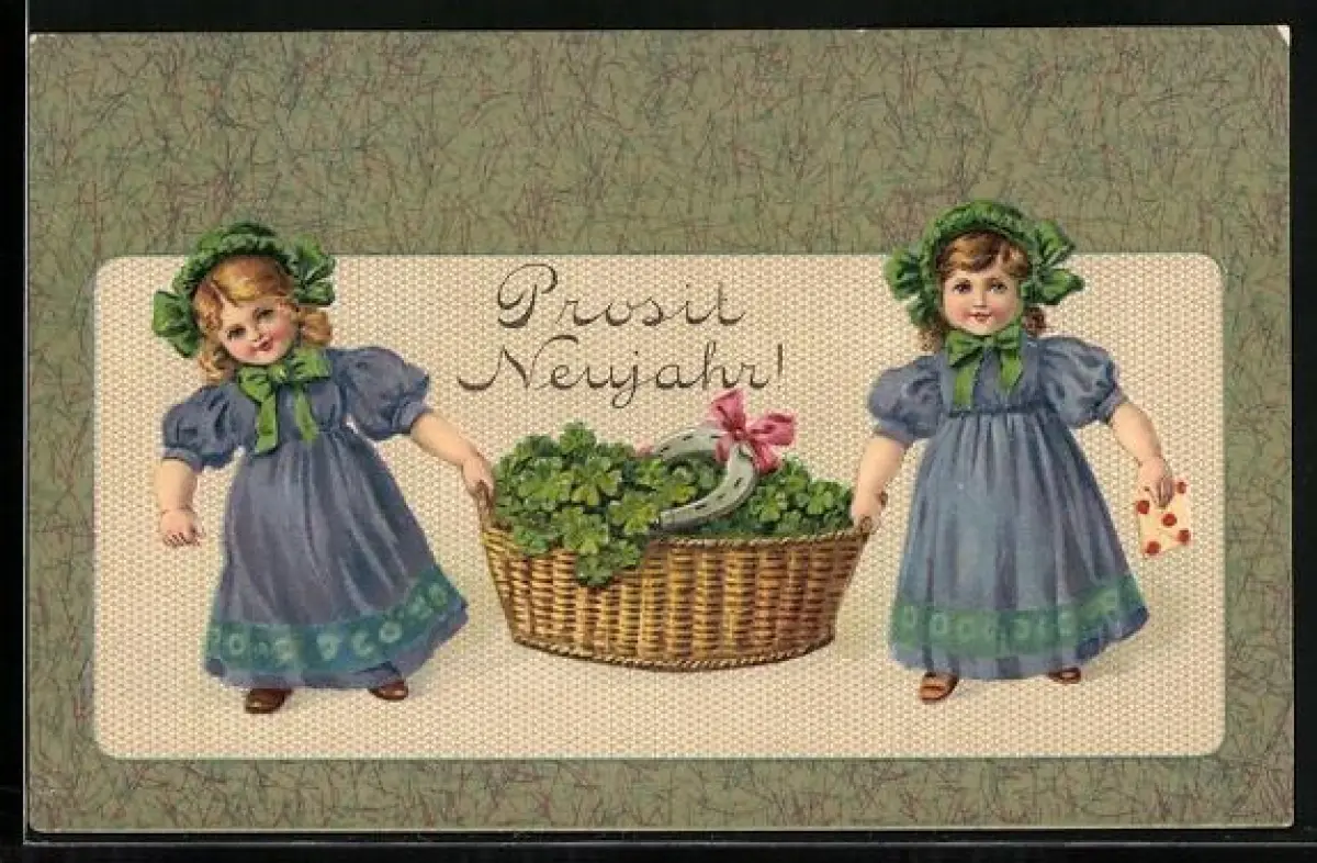 Präge-AK Zwei Kinder tragen einen Korb voller Klee mit einem Hufeisen, Prosit Neujahr