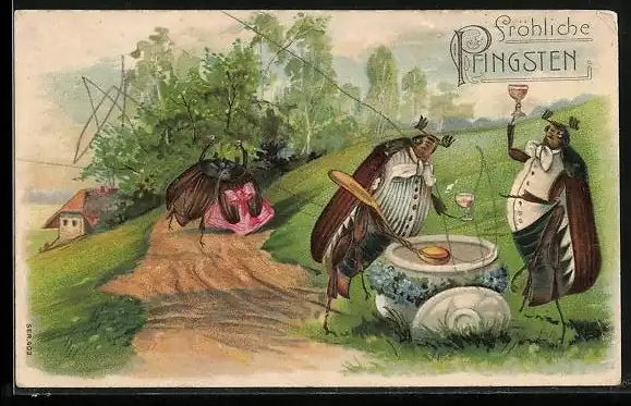 Präge-AK Zwei Maikäfer verkosten Pfingstbowle am Wegesrand, Maikäfer-Paar beim Spaziergang, Pfingstgruss