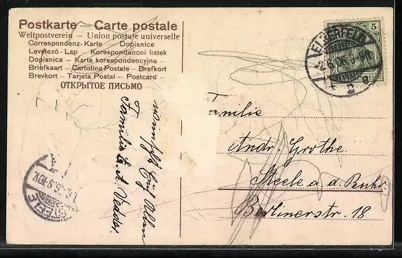 alte Ansichtskarte, gelaufen 1906, Eckknick oben re., guter Zustand