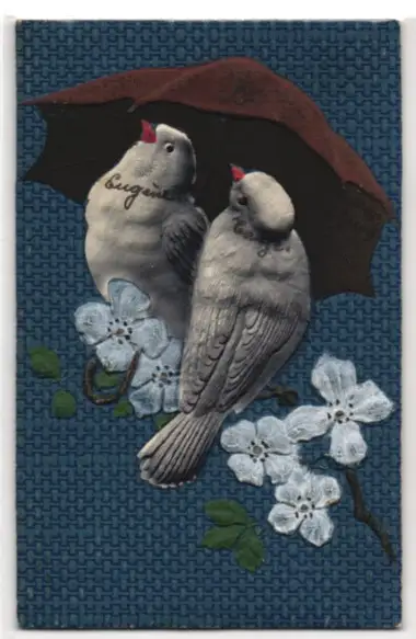 Präge-Airbrush-AK Vögel unterm Regenschirm