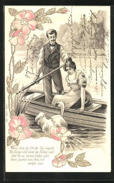 Präge-Lithographie Jugendstil, ein junges Paar auf dem See in einem Ruderboot