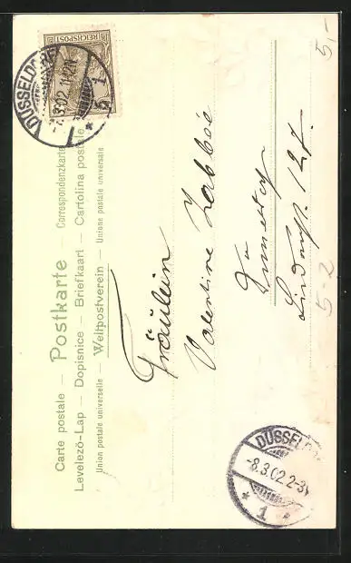 Personenbezogene Daten auf der Rückseite der Karte wurden durch blauen Textmarker unkenntlich gemacht. Die blauen Stellen sind auf die Vorderseite durchgeweicht und wirken sich negativ auf das Postkartenfoto aus