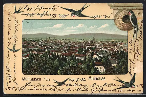 Präge-Lithographie Mülhausen i. Els., Ortsansicht aus der Vogelschau, Schwalben mit Nest