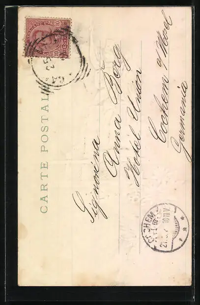 Personenbezogene Daten auf der Rückseite der Karte wurden durch blauen Textmarker unkenntlich gemacht. Die blauen Stellen sind auf die Vorderseite durchgeweicht und wirken sich negativ auf das Postkartenfoto aus