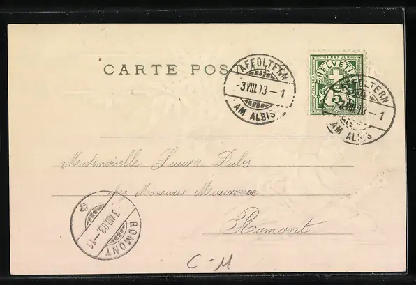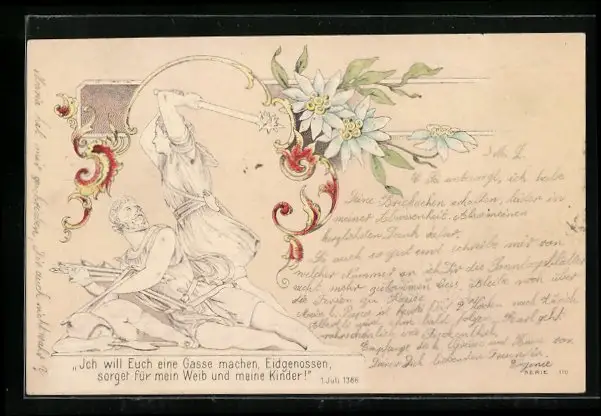 Präge-Lithographie Schweiz, Kämfende Krieger, Alpenblumen