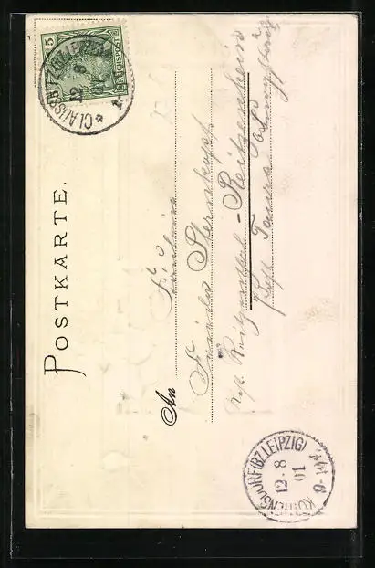 Personenbezogene Daten auf der Rückseite der Karte wurden durch blauen Textmarker unkenntlich gemacht. Die blauen Stellen sind auf die Vorderseite durchgeweicht und wirken sich negativ auf das Postkartenfoto aus