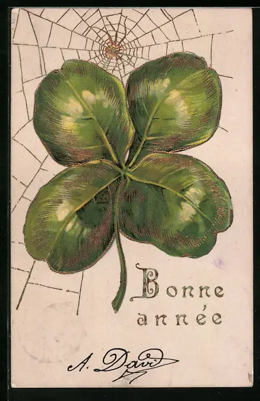 Präge-Lithographie Spinne im Netz über Kleeblatt, Neujahrsgruss