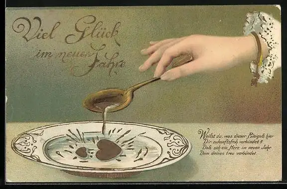 Präge-Lithographie Weibliche Hand beim Bleigiessen, Herzformen, Neujahrsgruss