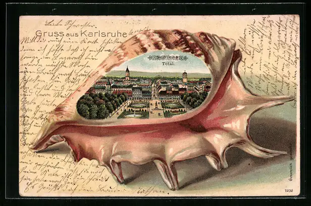 Präge-Passepartout-Lithographie Karlsruhe, Totalansicht in einer Muschel
