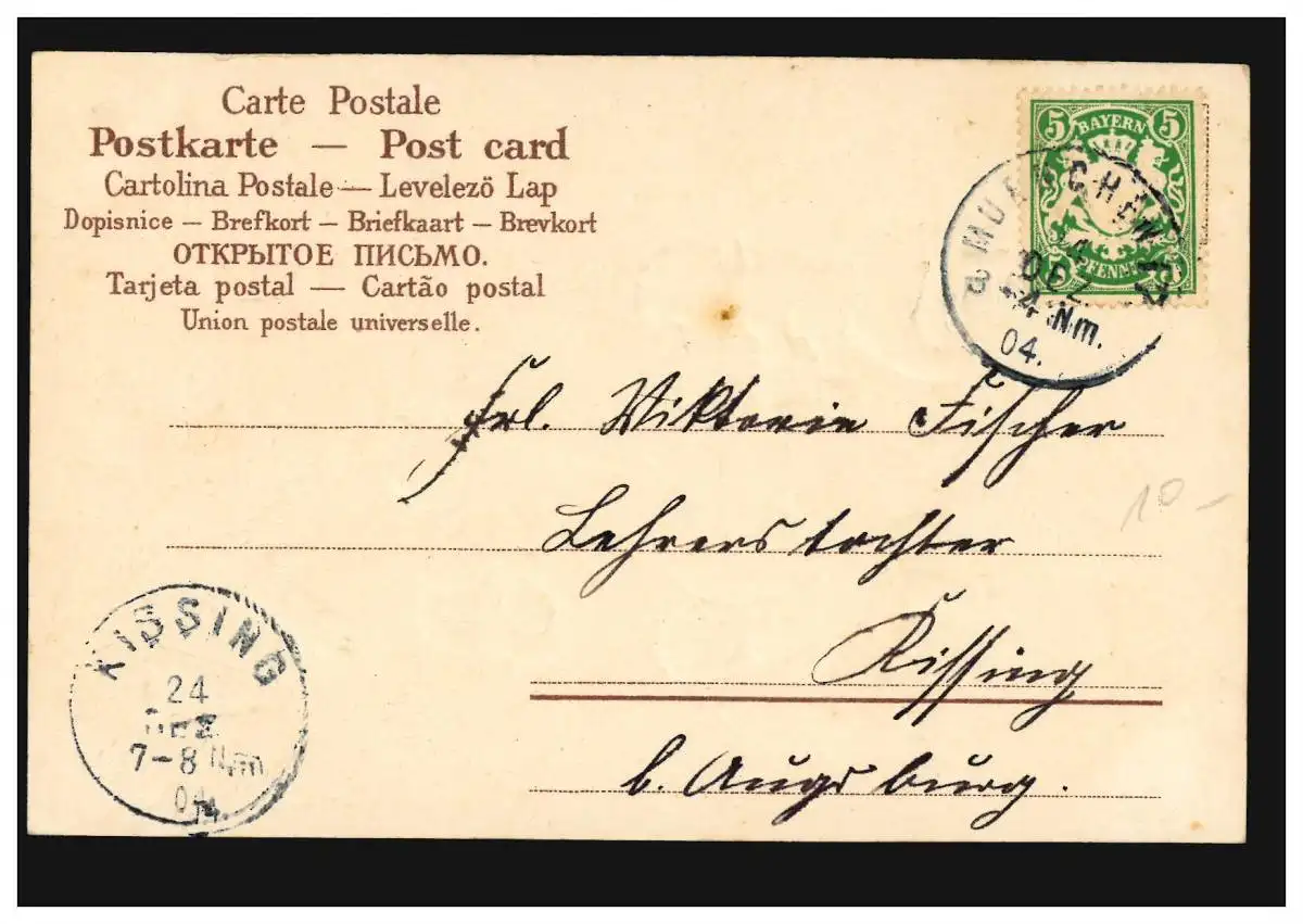 Prägekarte Fröhliche Weihnachten Engel mit Lebkuchenherz, MÜNCHEN 23.12.1904