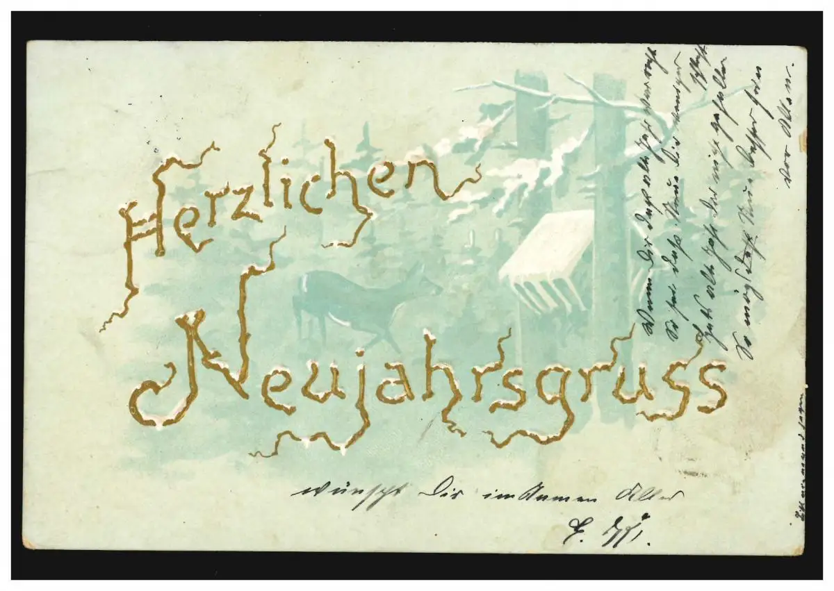 Prägekarte Neujahr Winterwald mit Reh an Futterkrippe, 1.1.1902